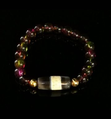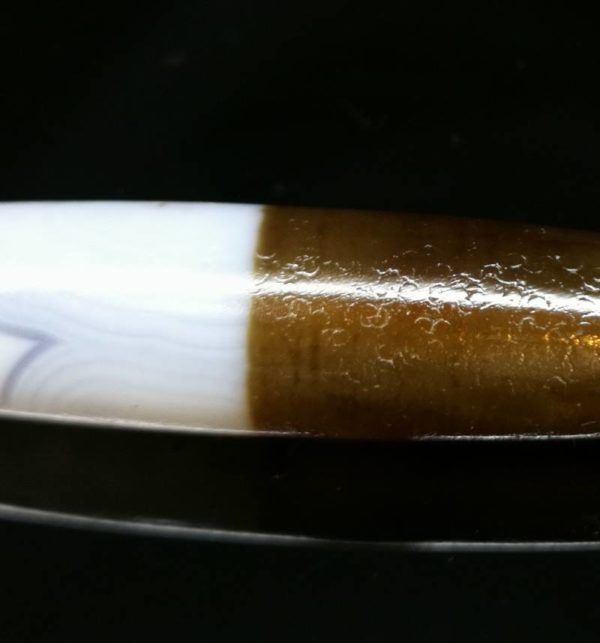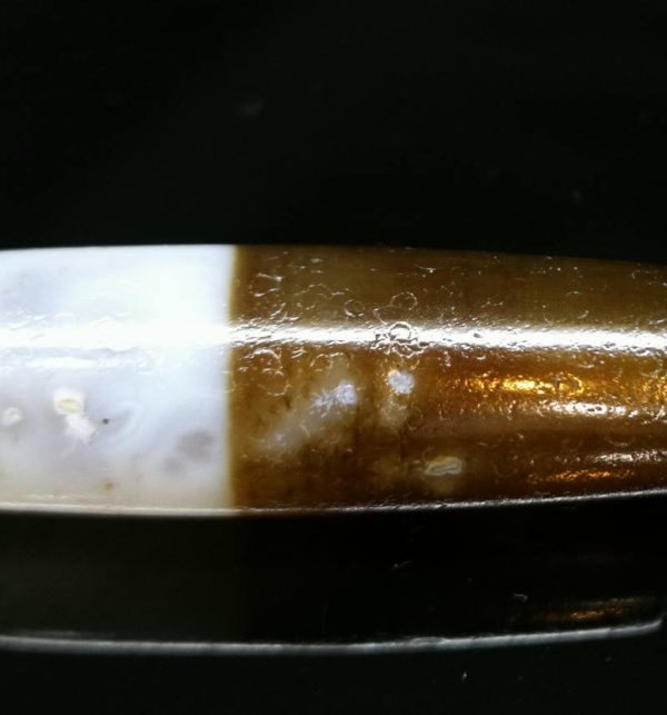 古珠乃通灵宝物,不但能够趋吉避凶,增强内气,提升顿悟能力,还可保佑持有者获得福报,功名,财富及一切的圆满,能调伏一切业障重罪而不受到束缚,并可消灾延寿,增长福慧,调和五行命气。这是一颗精品千年古珠,千年宽一线镶蚀黑白日月天珠,天珠旁系,年份爆好,黑白分明,品相完好,咬色分明,镶蚀漂亮,仔细观瞻,不免慨叹造物之精绝以及悠悠岁月的魔力,非常漂亮的古珠.